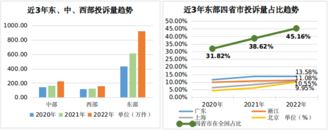 從近三年趨勢看,廣東、浙江、上海、北京4個省市的消費正在加速集聚。消費投訴數(shù)量與消費活躍水平呈正相關(guān)關(guān)系,四省市消費投訴數(shù)量在全國的占比從2020年的31.8%增長到2022年的45.16%。
