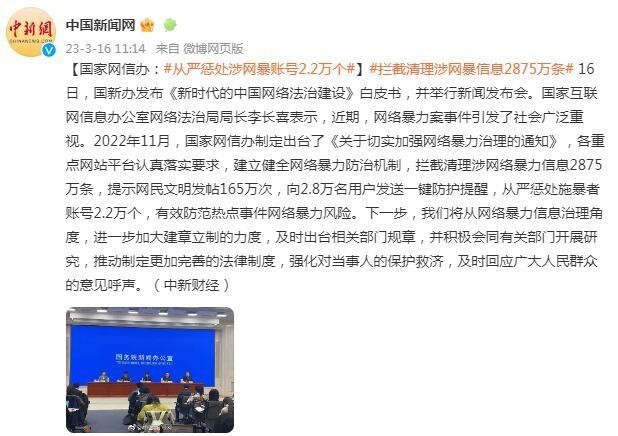 國家網(wǎng)信辦:攔截清理涉網(wǎng)絡(luò)暴力信息2875萬條,從嚴(yán)懲處涉網(wǎng)暴賬號(hào)2.2萬個(gè)
