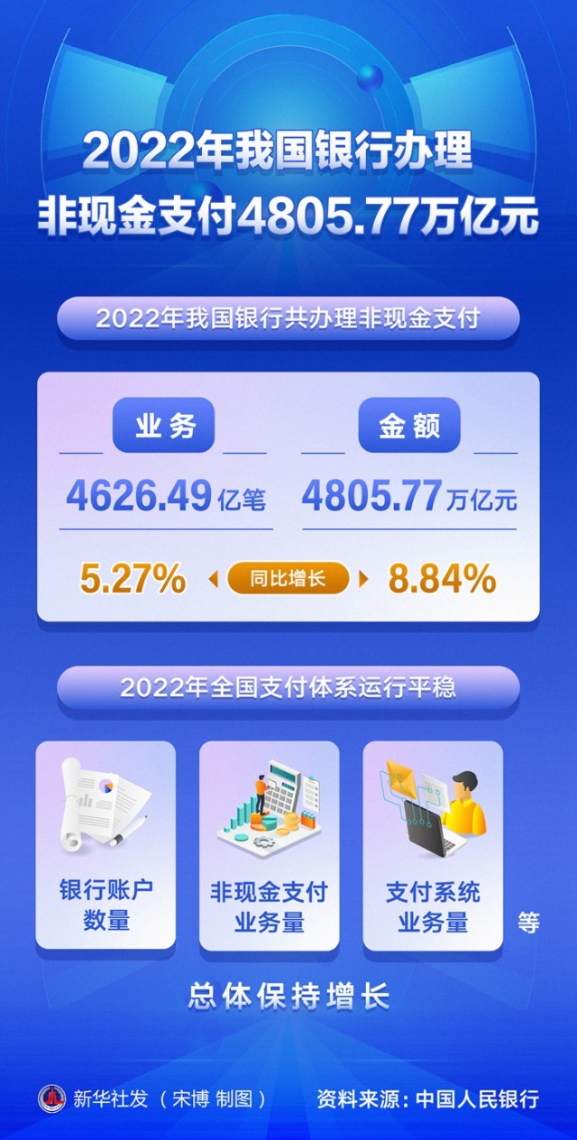 2022年我國(guó)銀行辦理非現(xiàn)金支付4805.77萬(wàn)億元