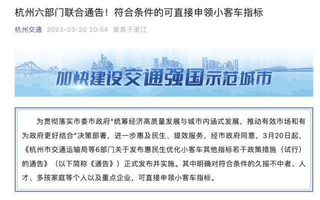 3月20日晚,杭州市交通運(yùn)輸局等6部門(mén)發(fā)布通告。(記者截圖)