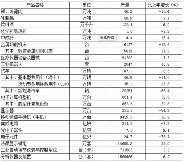 表6 2022年規(guī)模以上工業(yè)企業(yè)主要產(chǎn)品產(chǎn)量