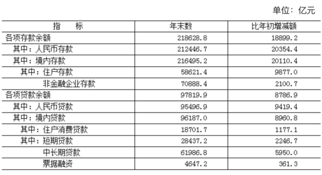 年末全市金融機構(gòu)(含外資)本外幣存款余額218628.8億元,比年初增加18899.2億元。全市金融機構(gòu)(含外資)本外幣貸款余額97819.9億元,比年初增加8786.9億元。