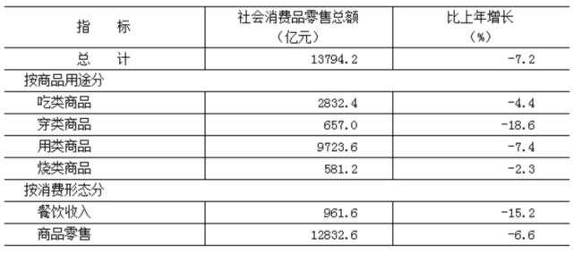 全年市場總消費額比上年下降4.9%。其中,服務(wù)性消費額下降2.9%;實現(xiàn)社會消費品零售總額13794.2億元,下降7.2%。