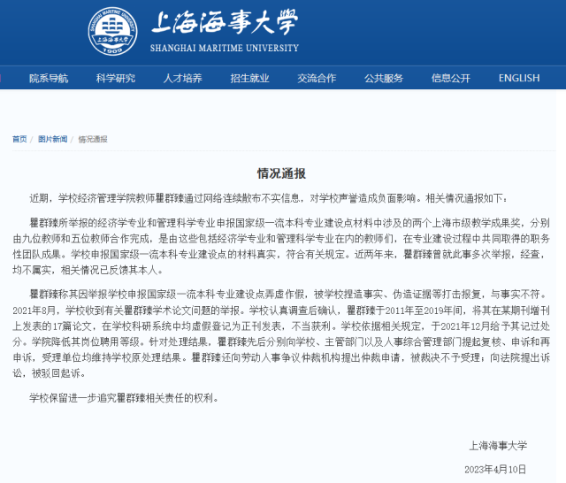 上海海事大學被舉報弄虛作假,校方發(fā)布情況通報:經查,均不屬實