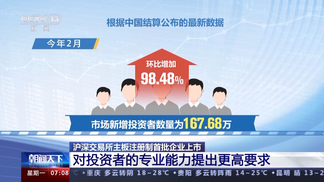 根據(jù)中國結(jié)算公布的最新數(shù)據(jù),今年2月,市場新增投資者數(shù)量為167.68萬,環(huán)比增加98.48%,這是時隔4個月之后,市場單月新增投資者數(shù)量再次超過百萬。截至2月末,我國A股投資者已達到2.14億。專家表示,全面實行注冊制,一些市場規(guī)則隨之調(diào)整,投資者需要審慎進行判斷。