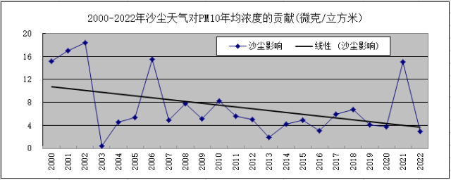 2000-2022年沙塵天氣對PM10年均濃度貢獻變化圖。圖片來源:北京市生態(tài)環(huán)境監(jiān)測中心