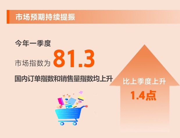 今年以來經濟循環(huán)加快暢通,市場需求逐步恢復,消費勢頭有所好轉,市場預期明顯恢復。一季度,市場指數為81.3,環(huán)比上升1.4點。所調查的8個行業(yè)中,國內訂單指數和銷售量指數均上升,7個行業(yè)銷售價格指數上升。