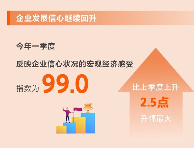 今年以來,我國經濟運行持續(xù)回暖,增長動能不斷釋放,發(fā)展信心明顯增強。一季度,反映企業(yè)信心狀況的宏觀經濟感受指數為99.0,比上季度上升2.5點,升幅最大。從宏觀經濟感受指數的細項看,宏觀感受指數為103.6,比上季度上升2.4點,高于景氣臨界值100;行業(yè)運行指數為94.3,比上季度上升2.6點,升幅較大。