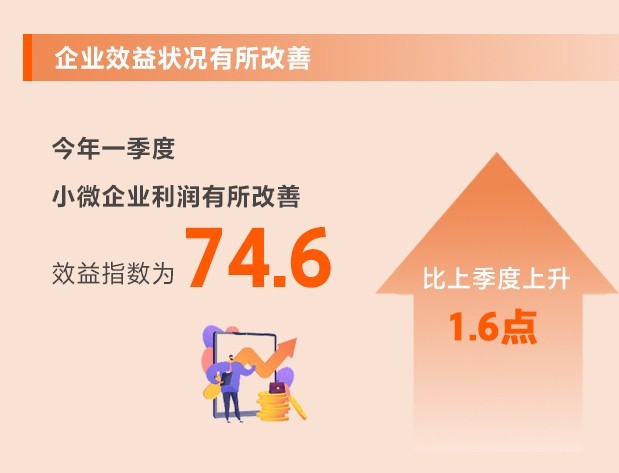 企業(yè)生產經營加速恢復,原材料價格漲幅收窄,以及延續(xù)優(yōu)化減稅降費政策減輕企業(yè)負擔,小微企業(yè)利潤有所改善。一季度,效益指數為74.6,比上季度上升1.6點,反彈幅度較大,但仍處于歷史較低位。所調查的8個行業(yè)效益指數均有所上升。