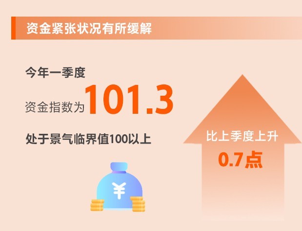 央行降準以及指導金融機構繼續(xù)支持小微企業(yè),多措并舉“精準滴灌”,小微企業(yè)融資狀況不斷改善。一季度,資金指數為101.3,比上季度上升0.7點,處于景氣臨界值100以上。其中,流動資金指數為86.3,比上季度上升1.1點;融資指數為90.8,環(huán)比上升0.5點。所調查的8個行業(yè)中,8個行業(yè)流動資金指數、6個行業(yè)融資指數均上升。
