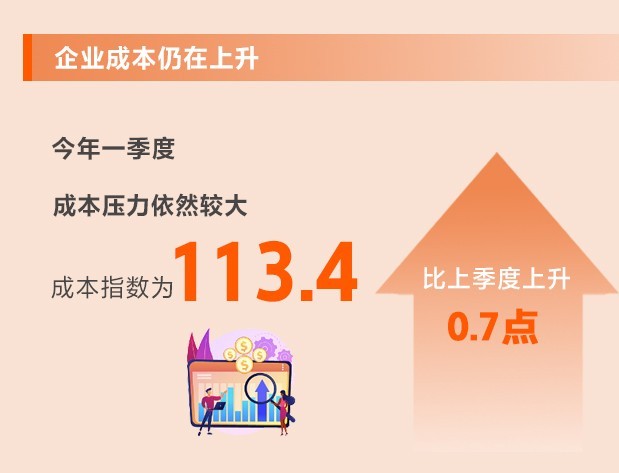 全球通脹仍處于高位,美聯(lián)儲急速加息對世界經濟影響的外溢效應持續(xù)顯現(xiàn)。中小企業(yè)多位于產業(yè)鏈下游且面對消費者,需求疲弱情況下難以轉嫁上游原材料價格上漲的壓力,同時還面臨人力成本上行以及房屋租金較高等困難。一季度,成本指數為113.4,比上季度上升0.7點,仍處于不景氣區(qū)間,說明成本壓力依然較大。所調查的8個行業(yè)中,7個行業(yè)生產成本指數、8個行業(yè)勞動力成本指數均上升。