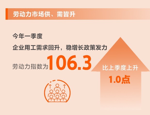 隨著生產生活秩序的恢復,人員流動性的提高,企業(yè)用工需求開始回升,同時穩(wěn)增長政策持續(xù)發(fā)力,從業(yè)人數有所上升。一季度,勞動力指數為106.3,比上季度上升1.0點。其中,供應指數為113.6,比上季度上升0.1點;需求指數為98.9,比上季度上升1.9點。