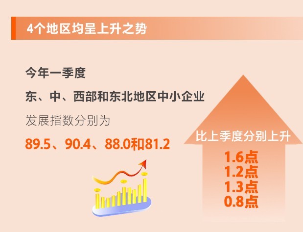 一季度,東、中、西部和東北地區(qū)中小企業(yè)發(fā)展指數分別為89.5、90.4、88.0和81.2,比上季度分別上升1.6、1.2、1.3和0.8點,東部地區(qū)指數上升幅度最大,中部地區(qū)指數最高,說明東部和中部地區(qū)經濟和中小微企業(yè)恢復較快。