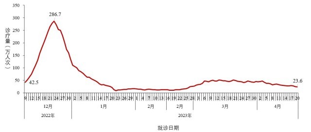 ?。ㄒ唬┛傮w就診人數(shù)結(jié)果。全國(不含港澳臺)發(fā)熱門診(診室)就診人數(shù)于2022年12月23日達(dá)到峰值286.7萬人次,隨后連續(xù)下降;2023年1月23日后就診人數(shù)呈現(xiàn)低位波動,約6周(2月24日-4月6日)的波動增加及平臺波動后,近2周(4月7日-4月20日)呈下降趨勢,4月20日為23.6萬人次,較峰值下降了91.8%(圖2-1)。
