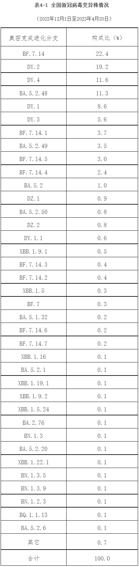 ?。ǘ?2月以來本土病例病毒變異株監(jiān)測情況。2022年12月1日至2023年4月20日,全國共報送32993例本土病例新冠病毒基因組有效序列,均為奧密克戎變異株,涵蓋117個進(jìn)化分支。主要流行株為BA.5.2及其亞分支(構(gòu)成比64.3%)和BF.7及其亞分支(構(gòu)成比33.0%)等。其中,BA.5.2及其亞分支包括DY.2(19.2%)、DY.4(11.6%)、BA.5.2.48(11.3%)、DY.1(8.6%)、DY.3(5.6%)和BA.5.2.49(3.5%)等;BF.7及其亞分支包括BF.7.14(22.4%)、BF.7.14.1(3.7%)、BF.7.14.5(3.0%)、BF.7.14.4(2.4%)、BF.7.14.3(0.4%)和BF.7.14.2(0.3%)等(表4-1)。共監(jiān)測到本土重點關(guān)注變異株603例,其中,4例BQ.1、4例BQ.1.1、19例BQ.1.1.13、1例BQ.1.1.17、1例BQ.1.1.18、1例BQ.1.1.35、1例BQ.1.1.38、1例BQ.1.1.46、1例BQ.1.1.53、2例BQ.1.1.66、1例BQ.1.1.69、8例BQ.1.2、1例BQ.1.23、2例BQ.1.8、2例CH.1.1、3例CH.1.1.1、1例CH.1.1.11、1例DT.2、1例EA.1、2例EG.1、3例EL.1、7例EM.1、1例EU.1.1、2例FB.1、3例FE.1、1例XBB、4例XBB.1、2例XBB.1.11.1、1例XBB.1.12、4例XBB.1.15、42例XBB.1.16、5例XBB.1.16.1、16例XBB.1.17.1、37例XBB.1.19.1、2例XBB.1.22、22例XBB.1.22.1、1例XBB.1.23、5例XBB.1.24、1例XBB.1.4、109例XBB.1.5、2例XBB.1.5.11、9例XBB.1.5.12、2例XBB.1.5.15、7例XBB.1.5.23、35例XBB.1.5.24、1例XBB.1.5.28、1例XBB.1.5.32、1例XBB.1.5.36、1例XBB.1.5.5、2例XBB.1.5.7、2例XBB.1.9、163例XBB.1.9.1、35例XBB.1.9.2、1例XBB.1.9.3、1例XBB.1.9.5、11例XBB.2.3、1例XBB.2.3.2、1例XBB.2.4和2例XBB.3。