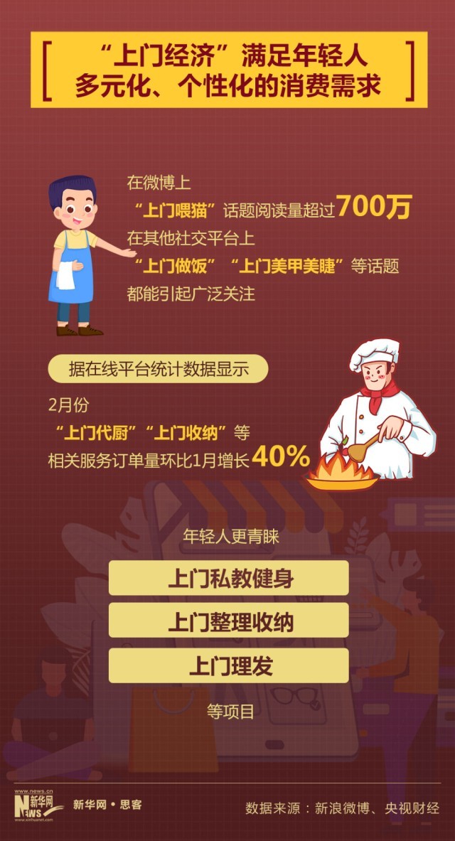2023年春節(jié),不少選擇回老家過年的消費(fèi)者,通過網(wǎng)絡(luò)平臺(tái)預(yù)約上門喂養(yǎng)寵物等服務(wù)。在微博上,僅“上門喂貓”話題就超過700萬的閱讀量;而在其他社交平臺(tái)上,“上門喂貓”“上門做飯”“上門美甲美睫”等話題也都能引起廣泛關(guān)注。據(jù)在線平臺(tái)統(tǒng)計(jì)數(shù)據(jù)顯示,2月份,以“上門代廚”“上門收納”等為代表的“上門經(jīng)濟(jì)”快速發(fā)展,相關(guān)服務(wù)訂單量環(huán)比1月增長40%。