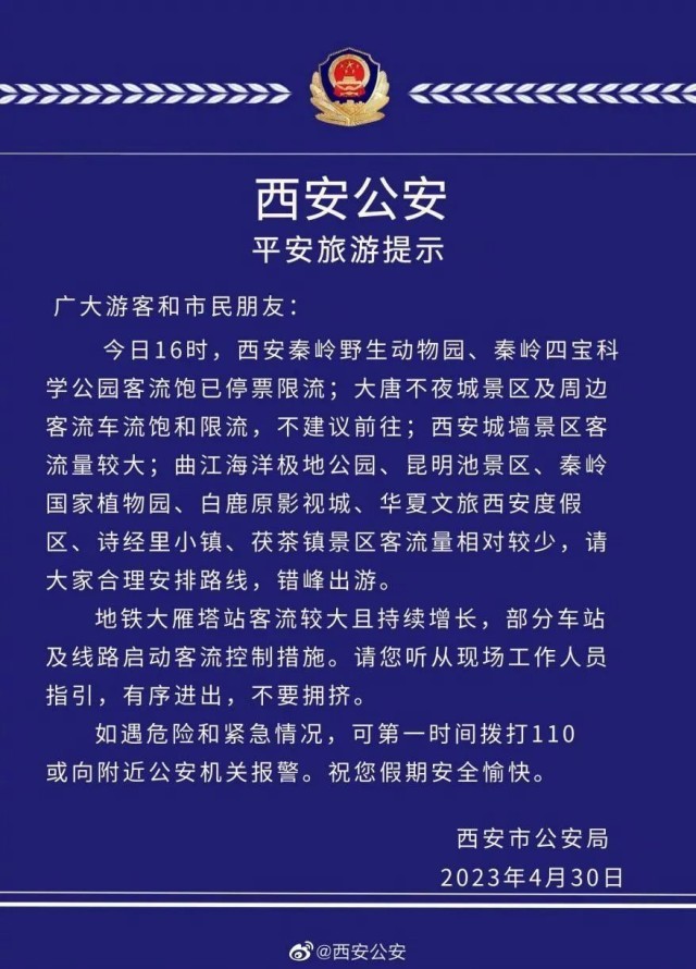 4月30日,西安多個(gè)景區(qū)停票限流。西安公安果斷發(fā)布旅游提示,不建議游客前往大唐不夜城,提示游客合理安排路線,錯(cuò)峰出游。