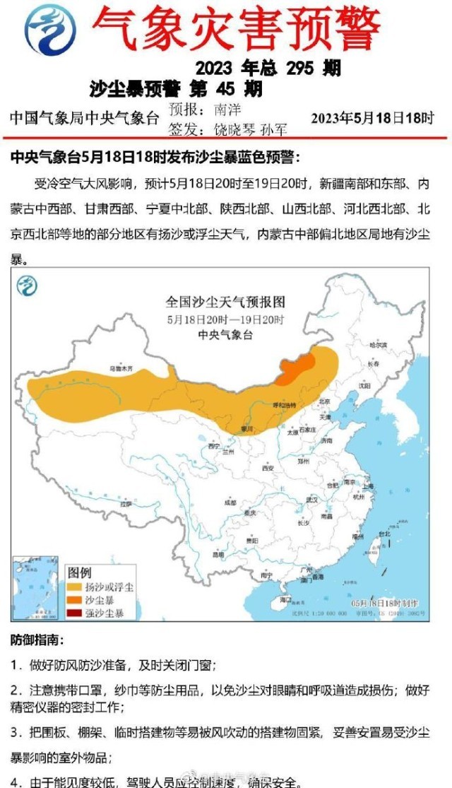 央視網(wǎng)消息:中央氣象臺5月18日18時發(fā)布沙塵暴藍色預(yù)警,受冷空氣大風影響,預(yù)計5月18日20時至19日20時,新疆南部和東部、內(nèi)蒙古中西部、甘肅西部、寧夏中北部、陜西北部、山西北部、河北西北部、北京西北部等地的部分地區(qū)有揚沙或浮塵天氣,內(nèi)蒙古中部偏北地區(qū)局地有沙塵暴。