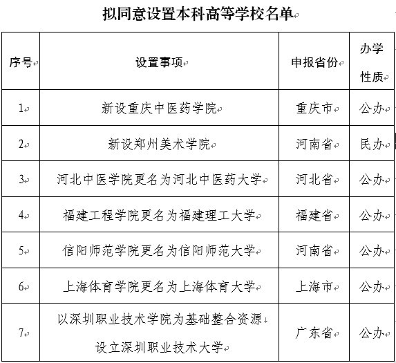 央視網(wǎng)消息:據(jù)教育部,根據(jù)《中華人民共和國高等教育法》《普通高等學校設置暫行條例》《普通本科學校設置暫行規(guī)定》《本科層次職業(yè)學校設置標準(試行)》等法律法規(guī)和規(guī)定,經(jīng)第八屆全國高等學校設置評議委員會專家考察評議,教育部黨組會議審議,擬同意設置重慶中醫(yī)藥學院等7所學校,現(xiàn)予公示。