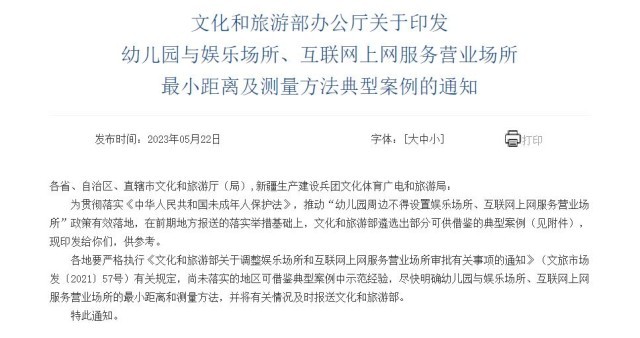 各地要嚴(yán)格執(zhí)行《文化和旅游部關(guān)于調(diào)整娛樂場所和互聯(lián)網(wǎng)上網(wǎng)服務(wù)營業(yè)場所審批有關(guān)事項的通知》(文旅市場發(fā)〔2021〕57號)有關(guān)規(guī)定,尚未落實的地區(qū)可借鑒典型案例中示范經(jīng)驗,盡快明確幼兒園與娛樂場所、互聯(lián)網(wǎng)上網(wǎng)服務(wù)營業(yè)場所的最小距離和測量方法,并將有關(guān)情況及時報送文化和旅游部。