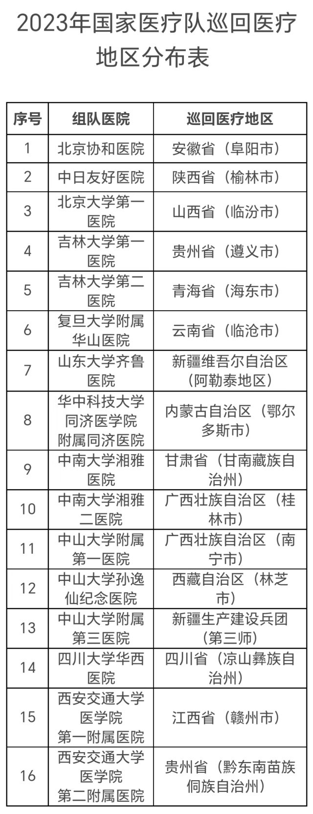 國(guó)家醫(yī)療隊(duì)的組隊(duì)醫(yī)院包括北京協(xié)和醫(yī)院、中日友好醫(yī)院等16家,分赴安徽、陜西等地,派出時(shí)間為6—10月。每支國(guó)家醫(yī)療隊(duì)不少于5人,以副高及以上職稱的醫(yī)務(wù)人員為主,重點(diǎn)開(kāi)展巡回醫(yī)療、技術(shù)和管理指導(dǎo)、人員培訓(xùn)、加強(qiáng)遠(yuǎn)程醫(yī)療協(xié)作網(wǎng)建設(shè)等工作。工作時(shí)間不少于3周,其中在縣域開(kāi)展工作的時(shí)間不少于兩周。