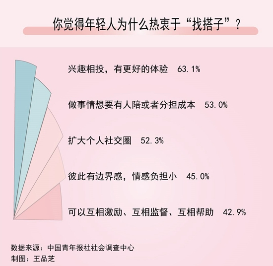 近日,中國青年報社社會調(diào)查中心聯(lián)合問卷網(wǎng)(wenjuan.com),對1335名受訪者進(jìn)行的一項調(diào)查顯示,63.1%的受訪青年認(rèn)為找“搭子”是因為興趣相投,有更好的體驗,53.0%的青年覺得是因為做事情想要有人陪或者分擔(dān)成本。