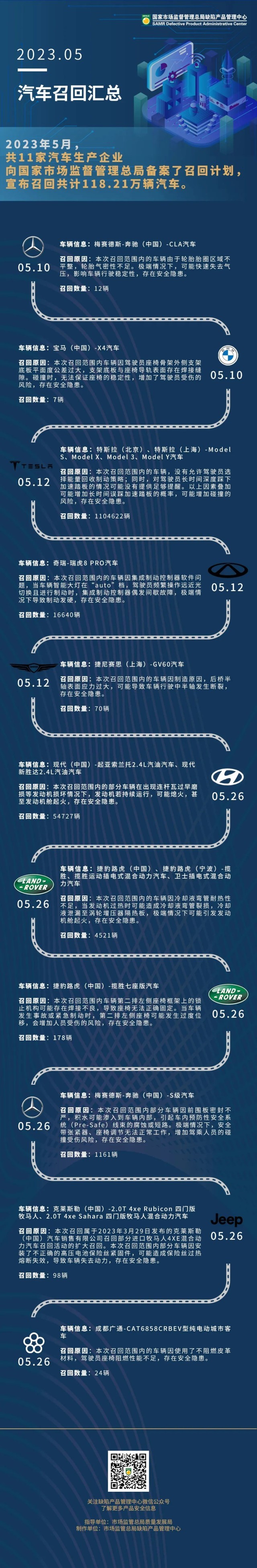 據(jù)“市說(shuō)新語(yǔ)”微信公眾號(hào)6月7日消息,2023年5月共11家汽車(chē)生產(chǎn)企業(yè)向市場(chǎng)監(jiān)管總局備案了召回計(jì)劃,宣布號(hào)回共計(jì)118.21萬(wàn)輛汽車(chē)。