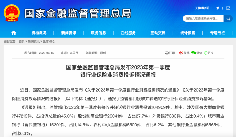 近日,國(guó)家金融監(jiān)督管理總局發(fā)布《關(guān)于2023年第一季度銀行業(yè)消費(fèi)投訴情況的通報(bào)》《關(guān)于2023年第一季度保險(xiǎn)消費(fèi)投訴情況的通報(bào)》(以下簡(jiǎn)稱(chēng)《通報(bào)》),通報(bào)了監(jiān)管部門(mén)接收并轉(zhuǎn)送的銀行業(yè)保險(xiǎn)業(yè)消費(fèi)投訴情況。