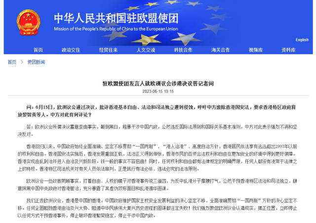 央視網(wǎng)消息:據(jù)中國(guó)駐歐盟使團(tuán)網(wǎng)站消息,駐歐盟使團(tuán)發(fā)言人就歐洲議會(huì)涉港決議答記者問(wèn)。