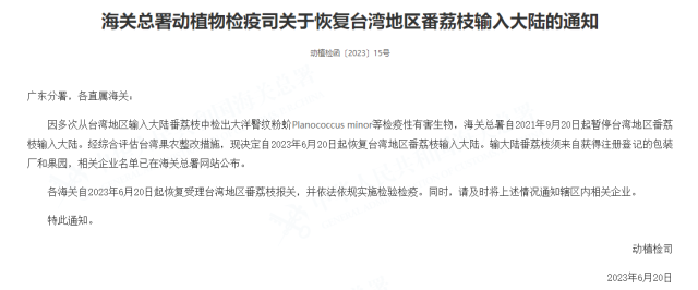 各海關自2023年6月20日起恢復受理臺灣地區(qū)番荔枝報關,并依法依規(guī)實施檢驗檢疫。同時,請及時將上述情況通知轄區(qū)內(nèi)相關企業(yè)。