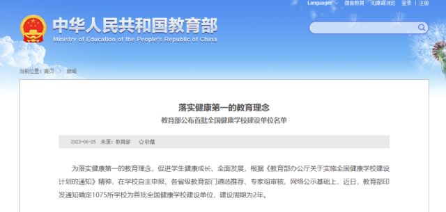 記者6月25日從教育部獲悉,為落實健康第一的教育理念,促進學生健康成長、全面發(fā)展,在學校自主申報、各省級教育部門遴選推薦、專家組審核、網(wǎng)絡公示基礎上,教育部近日印發(fā)通知,確定1075所學校為首批全國健康學校建設單位,建設周期為2年。