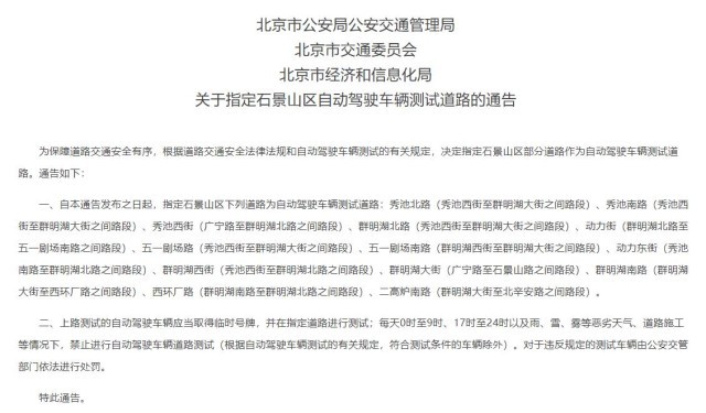為保障道路交通安全有序,根據(jù)道路交通安全法律法規(guī)和自動(dòng)駕駛車輛測(cè)試的有關(guān)規(guī)定,決定指定石景山區(qū)部分道路作為自動(dòng)駕駛車輛測(cè)試道路。