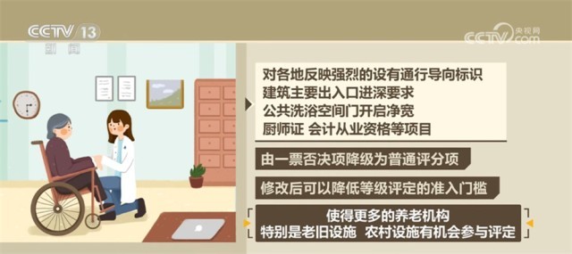 此次發(fā)布的指南包括環(huán)境、設(shè)施設(shè)備、運(yùn)營(yíng)管理、服務(wù)等多項(xiàng)內(nèi)容,與2020年發(fā)布的《<養(yǎng)老機(jī)構(gòu)等級(jí)劃分與評(píng)定>國(guó)家標(biāo)準(zhǔn)實(shí)施指南》(試行)相比,在框架、體例整體保持一致的前提下,刪除了一些可操作性不強(qiáng)以及非養(yǎng)老機(jī)構(gòu)必備的條件,對(duì)各地反映強(qiáng)烈的設(shè)有通行導(dǎo)向標(biāo)識(shí)、建筑主要出入口進(jìn)深要求、公共洗浴空間門開啟凈寬、廚師證、會(huì)計(jì)從業(yè)資格等項(xiàng)目,由一票否決項(xiàng)降級(jí)為普通評(píng)分項(xiàng),修改后可以降低等級(jí)評(píng)定的準(zhǔn)入門檻,使得更多的養(yǎng)老機(jī)構(gòu)特別是老舊設(shè)施、農(nóng)村設(shè)施有機(jī)會(huì)參與評(píng)定。