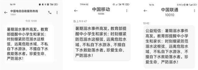 中國(guó)青年報(bào)客戶(hù)端北京7月13日電(中青報(bào)·中青網(wǎng)記者 樊未晨)記者今天從教育部獲悉,暑假來(lái)臨,教育部、工信部協(xié)調(diào)中國(guó)電信、中國(guó)移動(dòng)、中國(guó)聯(lián)通三大運(yùn)營(yíng)商,向全國(guó)手機(jī)用戶(hù)發(fā)送了暑期防溺水公益短信,提醒廣大中小學(xué)生和家長(zhǎng)增強(qiáng)安全意識(shí),營(yíng)造全社會(huì)關(guān)心支持預(yù)防學(xué)生溺水工作良好氛圍。