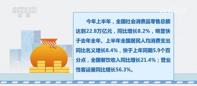 今年上半年,全國社會消費品零售總額達到22.8萬億元,同比增長8.2%,明顯快于去年全年。上半年全國居民人均消費支出同比名義增長8.4%,快于上年同期5.9個百分點,全國餐飲收入同比增長21.4%;營業(yè)性客運量同比增長56.3%。