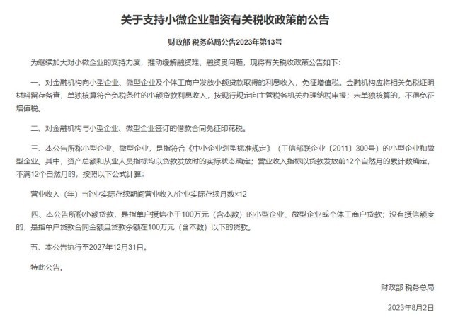 一、對(duì)金融機(jī)構(gòu)向小型企業(yè)、微型企業(yè)及個(gè)體工商戶發(fā)放小額貸款取得的利息收入,免征增值稅。金融機(jī)構(gòu)應(yīng)將相關(guān)免稅證明材料留存?zhèn)洳?,單?dú)核算符合免稅條件的小額貸款利息收入,按現(xiàn)行規(guī)定向主管稅務(wù)機(jī)關(guān)辦理納稅申報(bào);未單獨(dú)核算的,不得免征增值稅。