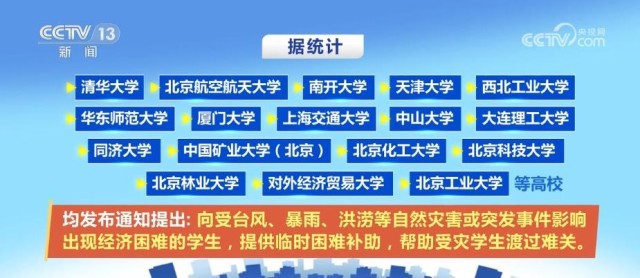 據(jù)統(tǒng)計,清華大學(xué)、北京航空航天大學(xué)、南開大學(xué)、天津大學(xué)、西北工業(yè)大學(xué)、華東師范大學(xué)、廈門大學(xué)、上海交通大學(xué)、中山大學(xué)、大連理工大學(xué)、同濟(jì)大學(xué)、中國礦業(yè)大學(xué)(北京)、北京化工大學(xué)、北京科技大學(xué)、北京林業(yè)大學(xué)、對外經(jīng)濟(jì)貿(mào)易大學(xué)、北京工業(yè)大學(xué)等高校均發(fā)布通知提出,向受臺風(fēng)、暴雨、洪澇等自然災(zāi)害或突發(fā)事件影響出現(xiàn)經(jīng)濟(jì)困難的學(xué)生,提供臨時困難補(bǔ)助,幫助受災(zāi)學(xué)生渡過難關(guān)。