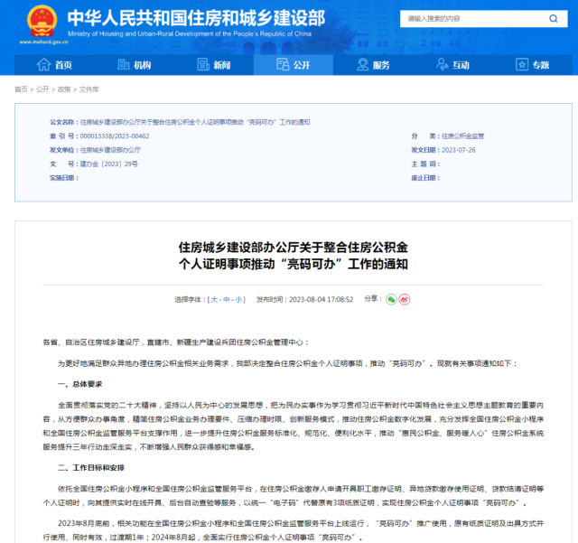 通知提到,2023年8月底前,相關(guān)功能在全國住房公積金小程序和全國住房公積金監(jiān)管服務(wù)平臺上線運行,“亮碼可辦”推廣使用,原有紙質(zhì)證明及出具方式并行使用、同時有效,過渡期1年;2024年8月起,全面實行住房公積金個人證明事項“亮碼可辦”。通知還提出精簡整合證明材料、調(diào)整證明開具方式、暢通窗口查驗功能、優(yōu)化業(yè)務(wù)辦理流程、健全協(xié)同工作機制五項工作任務(wù)。
