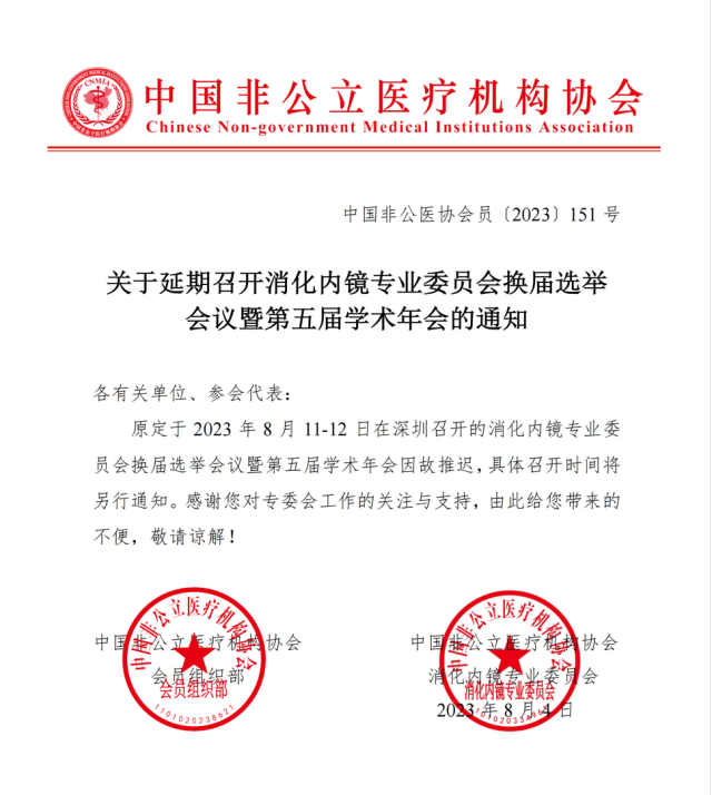 消化內(nèi)鏡專業(yè)委員會(huì)換屆選舉會(huì)議暨第五屆學(xué)術(shù)年會(huì)延期通知。圖片來(lái)源:中國(guó)非公立醫(yī)療機(jī)構(gòu)協(xié)會(huì)