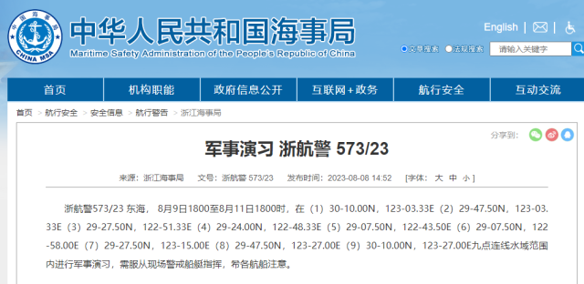據(jù)中國海事局網站消息,浙江海事局發(fā)布航行警告,8月9日18時至8月11日18時,東海部分海域進行軍事演習,需服從現(xiàn)場警戒船艇指揮,希各航船注意。