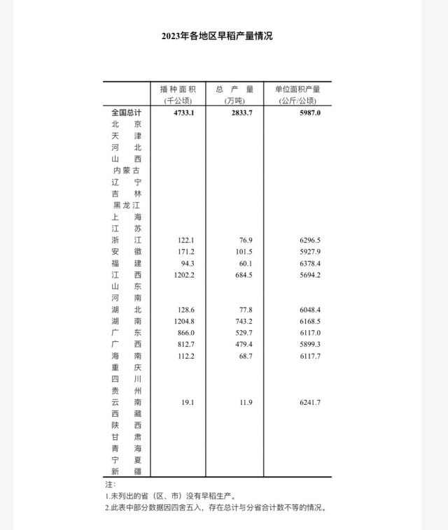 國家統(tǒng)計(jì)局今天發(fā)布數(shù)據(jù)顯示,2023年,全國早稻總產(chǎn)量566.7億斤,比2022年增加4.3億斤,增長0.8%。全國早稻播種面積7099.7萬畝,單位面積產(chǎn)量399.1公斤/畝,比2022年增加4.8公斤/畝,增長1.2%。