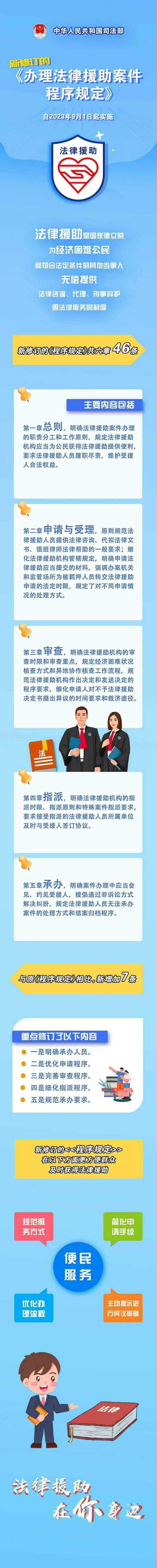 為貫徹落實法律援助法,提高法律援助案件辦理程序的標(biāo)準化規(guī)范化水平,司法部對2012年公布并施行的《辦理法律援助案件程序規(guī)定》進行了全面修訂,修訂后的《程序規(guī)定》,在方便群眾及時獲得法律援助、提高法律援助服務(wù)質(zhì)量等方面,作出了一系列具體規(guī)定?!冻绦蛞?guī)定》自2023年9月1日起施行。