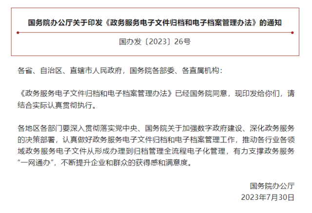 《辦法》就進一步規(guī)范政務(wù)服務(wù)電子文件歸檔和電子檔案管理,推動各行業(yè)各領(lǐng)域政務(wù)服務(wù)電子文件從形成辦理到歸檔管理全流程電子化,在機制和流程上提出明確要求,將有力支撐政務(wù)服務(wù)“一網(wǎng)通辦”。