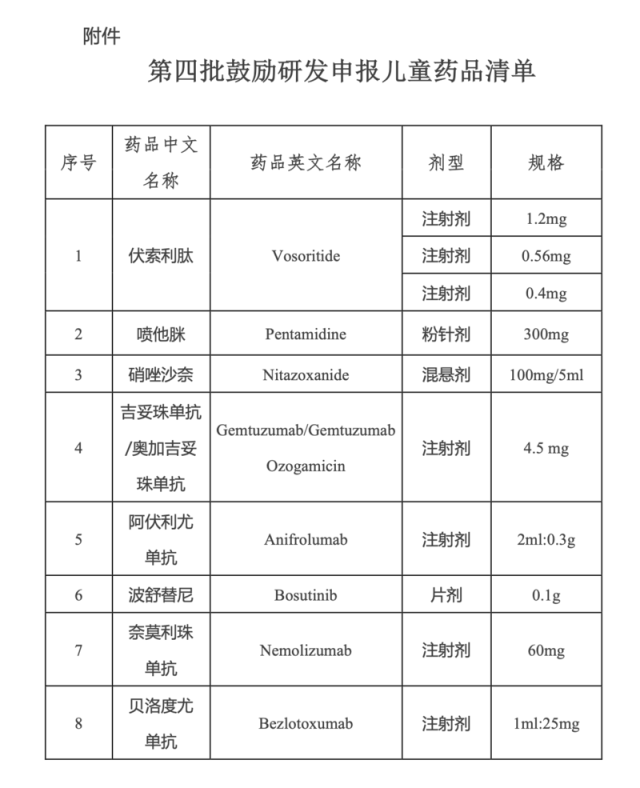 國(guó)家衛(wèi)健委發(fā)布的相關(guān)政策解讀中指出,《第四批清單》中的藥品在遴選時(shí),跟進(jìn)全球最新臨床進(jìn)展,將近年來(lái)國(guó)外已上市國(guó)內(nèi)未上市的兒童藥品和國(guó)內(nèi)已上市但無(wú)兒童適宜劑型規(guī)格藥品作為重點(diǎn)考慮,著重選擇安全性、有效性、適宜性高的品種。例如治療白血病的吉妥珠單抗、波舒替尼等藥品。
