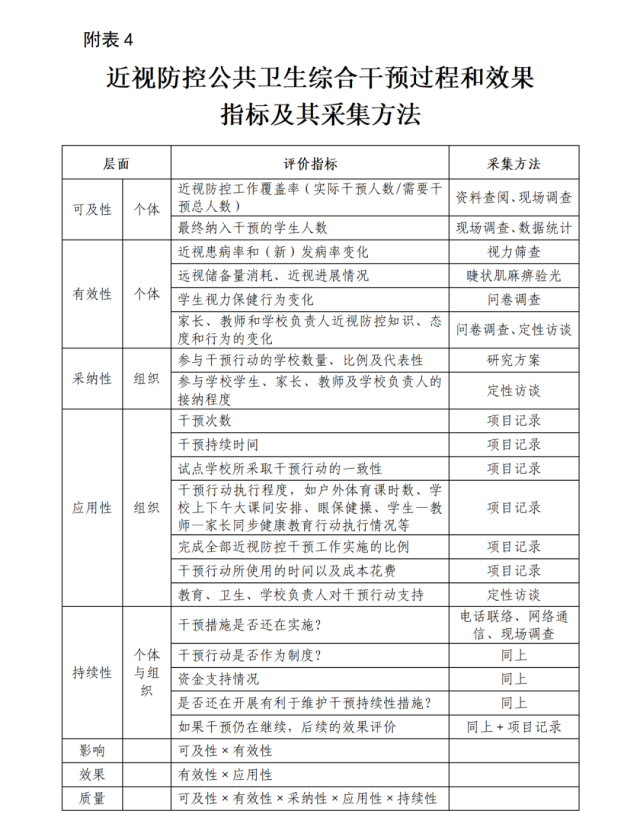 2.注重過(guò)程與效果評(píng)價(jià)。各級(jí)疾控機(jī)構(gòu)要定期開(kāi)展學(xué)生視力監(jiān)測(cè)工作,深入分析歷年監(jiān)測(cè)數(shù)據(jù),將監(jiān)測(cè)發(fā)現(xiàn)的主要學(xué)生健康問(wèn)題和建議及時(shí)報(bào)告當(dāng)?shù)卣??;趯?shí)施性研究方法,從理論向?qū)嵺`進(jìn)行轉(zhuǎn)化和應(yīng)用,可推進(jìn)干預(yù)行動(dòng)的實(shí)施與傳播。進(jìn)行過(guò)程與效果評(píng)價(jià),引入實(shí)施性研究框架和理論模型,如近視防控公共衛(wèi)生綜合干預(yù)過(guò)程和效果指標(biāo)及其采集方法(附表4),從個(gè)體層面和組織層面全面評(píng)價(jià)干預(yù)行動(dòng)的可及性、有效性、應(yīng)用性、可持續(xù)性,系統(tǒng)性地評(píng)估兒童青少年近視公共衛(wèi)生綜合干預(yù)的實(shí)施成效。