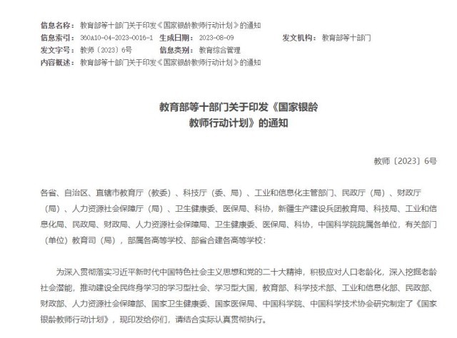 教育部等十部門(mén):經(jīng)過(guò)3年左右,全國(guó)銀齡教師隊(duì)伍總量力爭(zhēng)達(dá)12萬(wàn)人左右