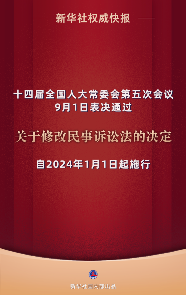 9月1日,十四屆全國(guó)人大常委會(huì)第五次會(huì)議表決通過(guò)關(guān)于修改民事訴訟法的決定,自2024年1月1日起施行。