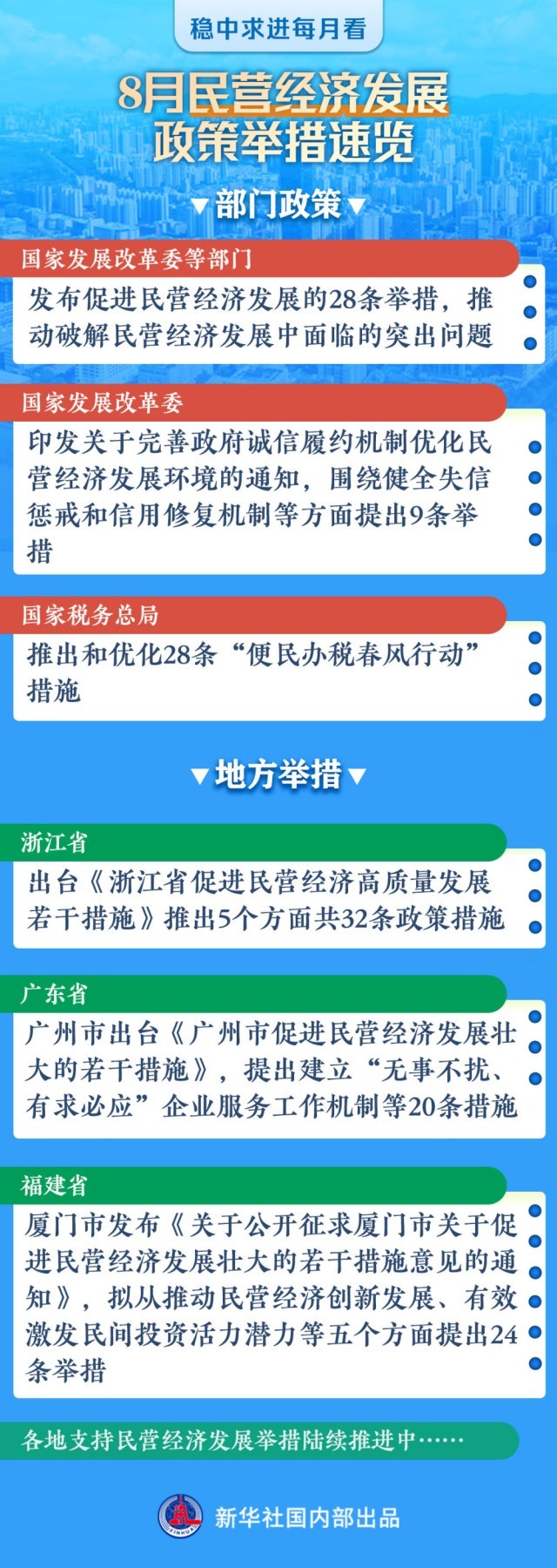 浙江省出臺(tái)促進(jìn)民營經(jīng)濟(jì)高質(zhì)量發(fā)展32條措施,提出向民營企業(yè)推介“三張項(xiàng)目清單”,為民間資本更好了解和參與重大項(xiàng)目提供平臺(tái);廣州市出臺(tái)促進(jìn)民營經(jīng)濟(jì)發(fā)展壯大的20條措施,提出建立“無事不擾、有求必應(yīng)”企業(yè)服務(wù)工作機(jī)制等;深圳市針對(duì)備受民營企業(yè)關(guān)注的放寬市場(chǎng)準(zhǔn)入、保護(hù)合法權(quán)益、清理拖欠企業(yè)賬款等方面,提出20條精準(zhǔn)有力舉措……