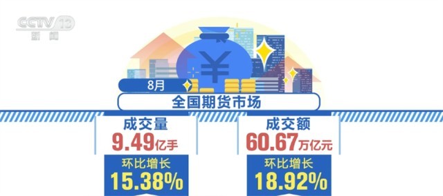 中國期貨業(yè)協(xié)會數(shù)據(jù)顯示,8月全國期貨市場成交量為9.49億手,成交額為60.67萬億元,同比分別增長47.76%和23.49%,環(huán)比分別增長15.38%和18.92%。