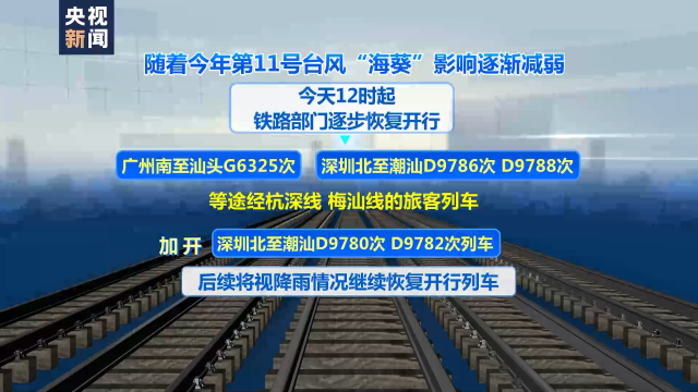 隨著今年第11號(hào)臺(tái)風(fēng)“海葵”影響逐漸減弱,5日12時(shí)起,鐵路部門逐步恢復(fù)開行廣州南至汕頭G6325次、深圳北至潮汕D9786次、D9788次等途經(jīng)杭深線、梅汕線的旅客列車,加開深圳北至潮汕D9780次、D9782次列車。后續(xù)將視降雨情況,繼續(xù)恢復(fù)開行列車。
